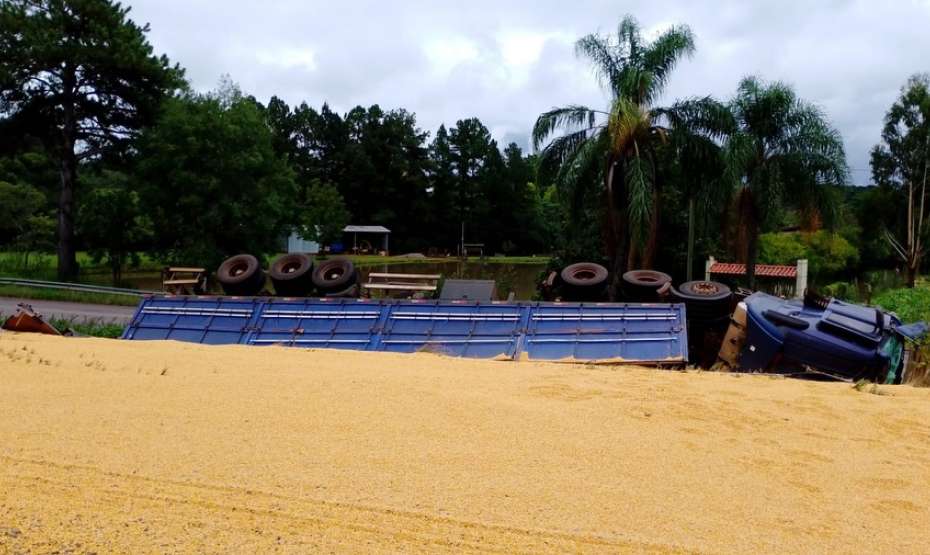 Caminhão tomba e carga de milho fica espalhada no trecho Passo Fundo/Marau