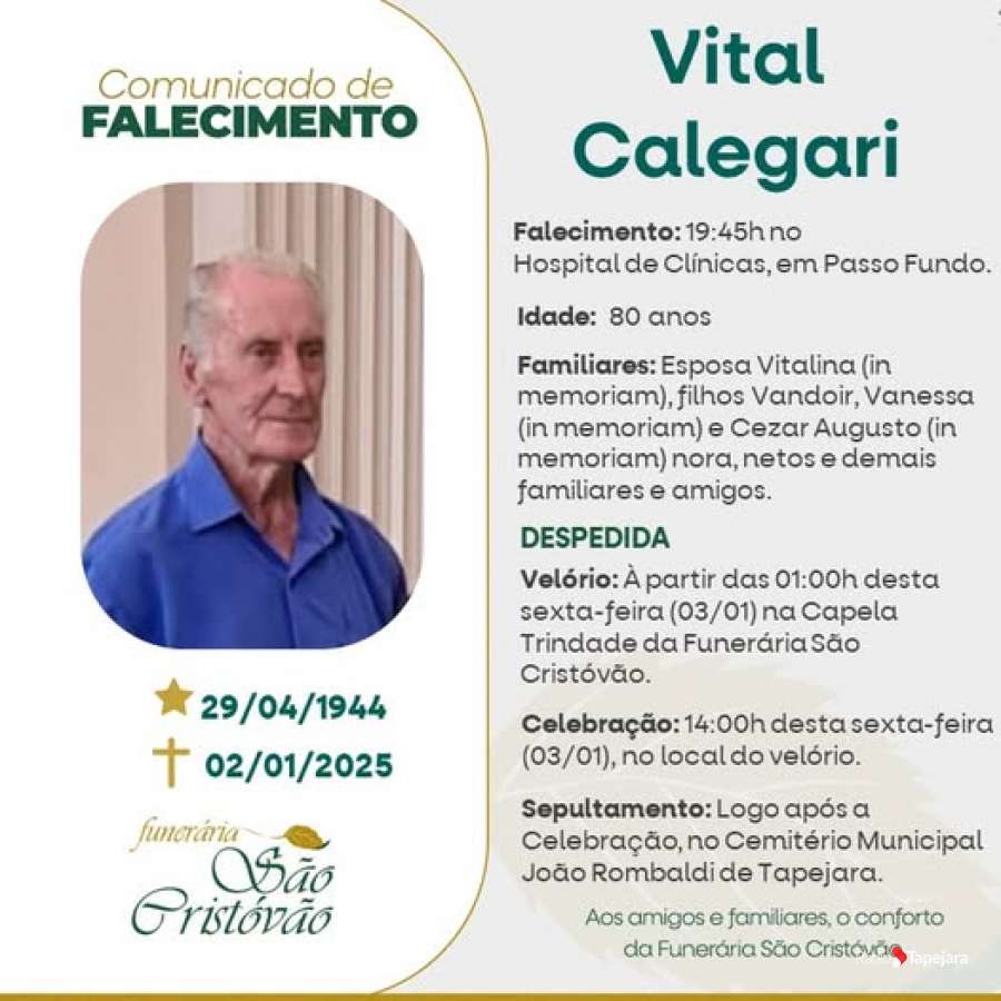 Faleceu VITAL CALEGARI às 19:45h de ontem 02/0, no Hospital de Clínicas de Passo Fundo, com 80 anos. / Está sendo velado na capela Trindade da Funerária São Cristóvão de Tapejara / A celebração acontece às 14h, no local do velório e logo após será sepultado no Cemitério João Rombaldi de Tapejara.