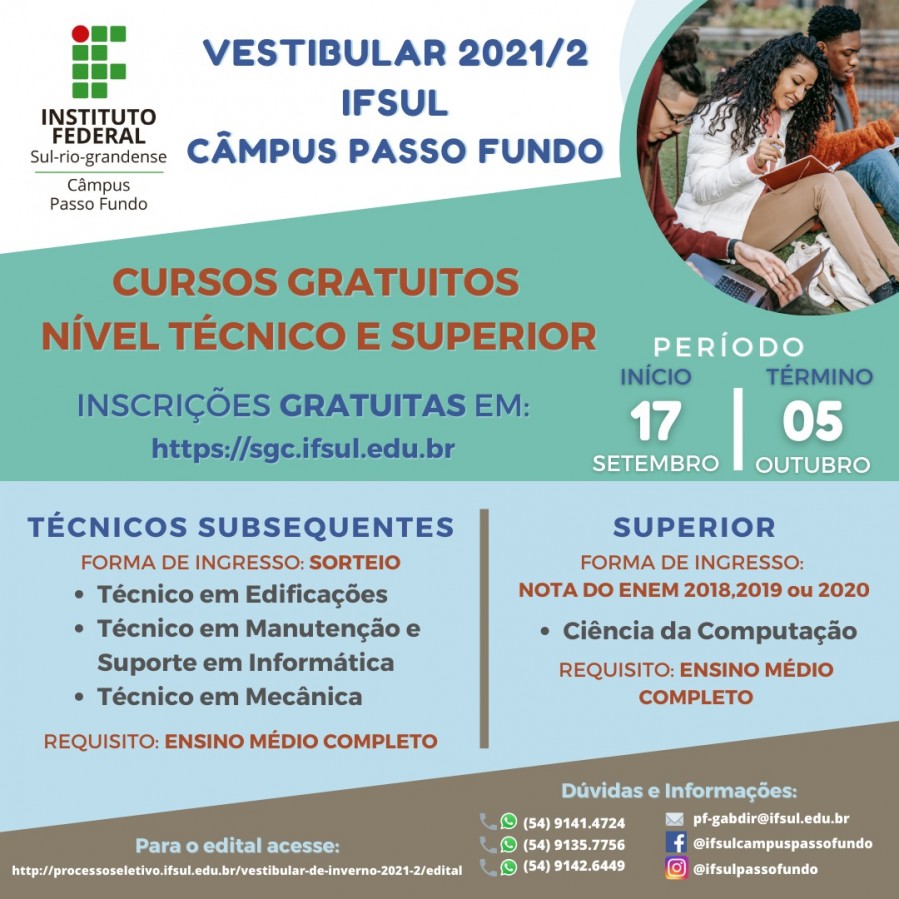 O Instituto Federal Sul-rio-grandense (IFSul), campus Passo Fundo, está com inscrições abertas para os seguintes cursos técnicos: Técnico em Mecânica, Técnico em Edificações e Técnico em Manutenção e Suporte em Informática; e para o curso superior de Bacharelado em Ciência da Computação.