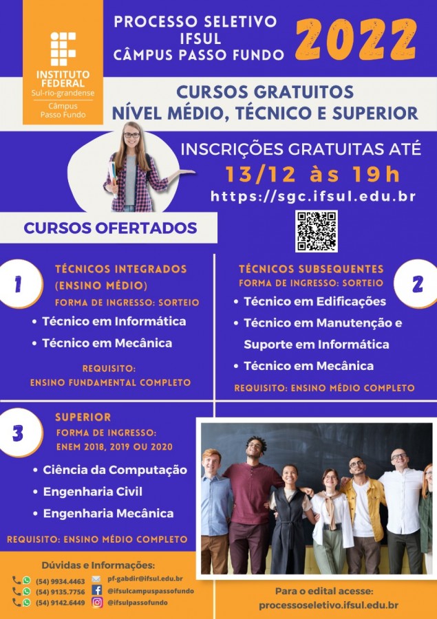 Mais informações podem ser obtidas pelo WhatsApp (54) 99934-4463 ou pelo site ingresso.passofundo.ifsul.edu.br.