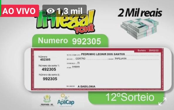 Tapejara também teve um ganhador, Pedrinho Leonir dos Santos, que comprou seu título na A Babilônia foi sorteado na rodada especial de 30 prêmios e levou R$ 2.000,00.