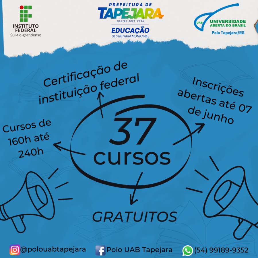 O Instituto Federal de Educação, Ciência e Tecnologia Sul-rio-grandense (IFSul), em parceria com o Polo UAB de Tapejara, abriu as inscrições para 37 cursos GRATUITOS de Formação Inicial e Continuada (FIC).