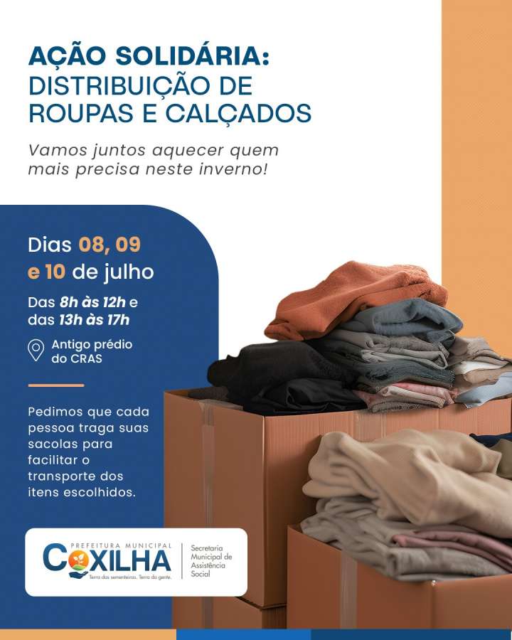 A Administração de Coxilha, por meio da Secretaria de Assistência Social e do CRAS, realizará uma Ação Solidária de doações com a distribuição de roupas, calçados e outros itens para pessoas e famílias em situação de vulnerabilidade social.
