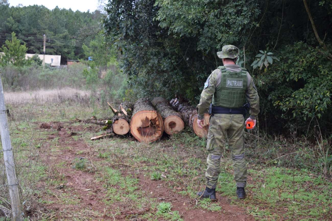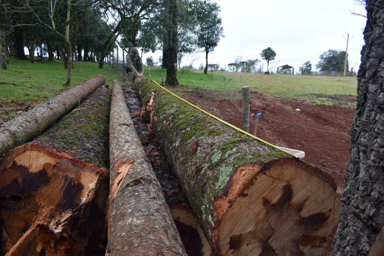 Durante a fiscalização, foi encontrada uma quantidade total de 17 toras de espécies nativas, sendo 16 de Pinheiro Brasileiro (Araucaria angustifolia) e uma de açoita-cavalo, totalizando aproximadamente 16 m³ de madeira.