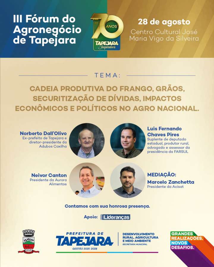 A terceira edição do Fórum do Agronegócio de Tapejara será realizada no dia 28 de agosto, no Centro Cultural José Maria Vigo da Silveira. A informação foi divulgada nesta segunda-feira (11) nas redes sociais do Governo.