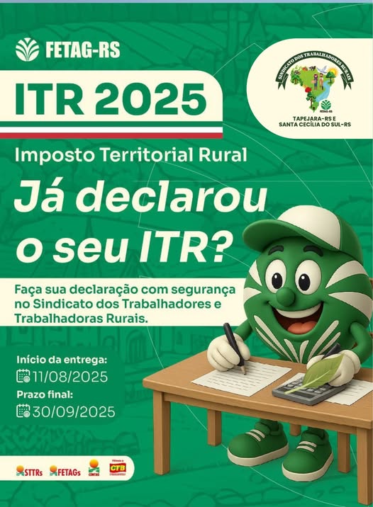 O prazo para a entrega da Declaração do Imposto Territorial Rural (ITR) encerra no dia 30 de setembro, e o Sindicato dos Trabalhadores Rurais de Tapejara e Santa Cecília do Sul reforça o alerta para que os agricultores não deixem para a última hora.