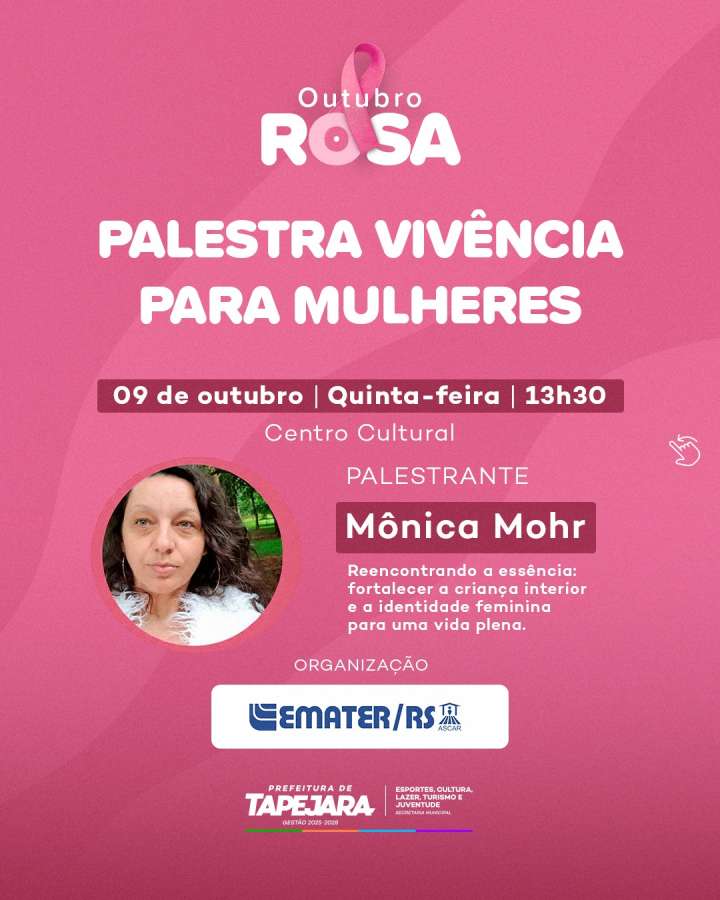 No dia 09 de outubro, às 13h30, no Centro Cultural de Tapejara, será realizada a palestra-vivência “Reencontrando a essência: fortalecer a criança interior e a identidade feminina para uma vida plena”, conduzida por Mônica Mohr. O encontro busca oferecer às mulheres um momento de reflexão e fortalecimento, com foco no autoconhecimento e no cuidado com a saúde emocional e física.