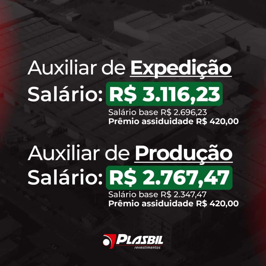 Para a função de Auxiliar de Expedição, o salário total é de R$ 3.116,23, sendo R$ 2.696,23 de salário base e R$ 420,00 referentes ao prêmio assiduidade. Já para a vaga de Auxiliar de Produção, a remuneração é de R$ 2.767,47, com salário base de R$ 2.347,47 mais R$ 420,00 de prêmio assiduidade.