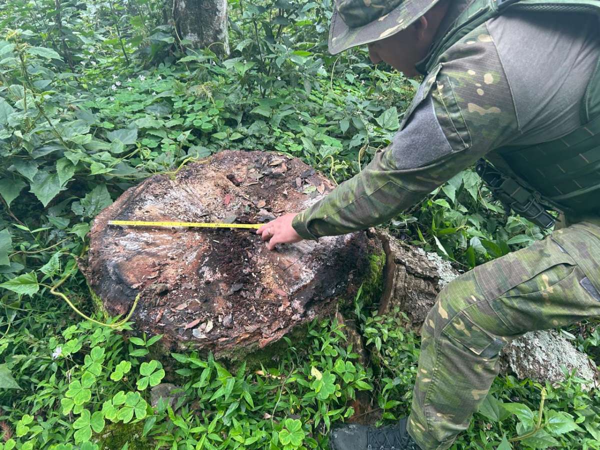 A equipe foi acionada após uma denúncia anônima e, ao chegar ao local, verificou o corte irregular de duas árvores de Pinheiro-Brasileiro (Araucaria angustifolia) — espécie nativa e protegida por lei. No ponto da extração restaram apenas os tocos, totalizando 7,77 metros cúbicos de madeira.