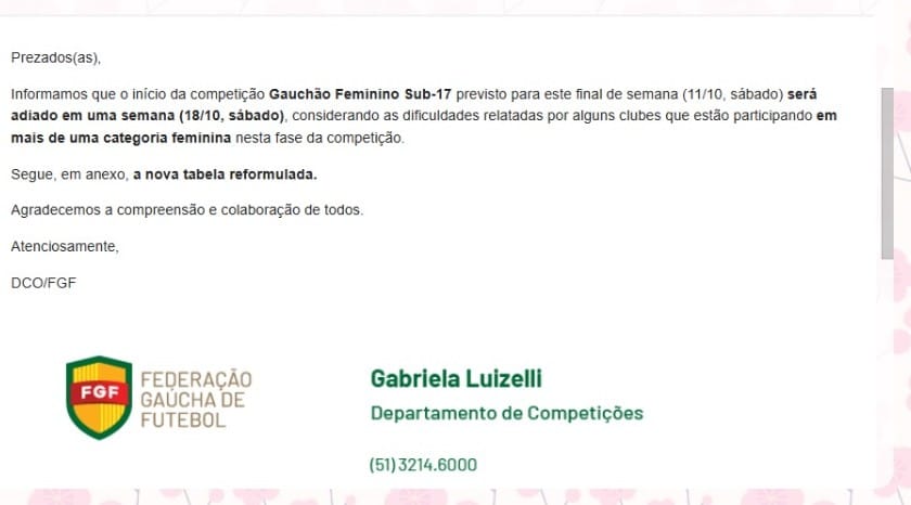 A Federação Gaúcha de Futebol (FGF) informou nesta quarta-feira (8) o adiamento do início do Campeonato Gaúcho Feminino Sub-17. A rodada de abertura, que seria realizada neste sábado (11), foi transferida para o dia 18 de outubro.