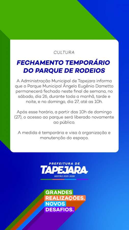 A Administração Municipal de Tapejara informa que o Parque Municipal Ângelo Eugênio Dametto permanecerá fechado neste final de semana, no sábado, dia 26, durante toda a manhã, tarde e noite, e no domingo, dia 27, até as 10h.