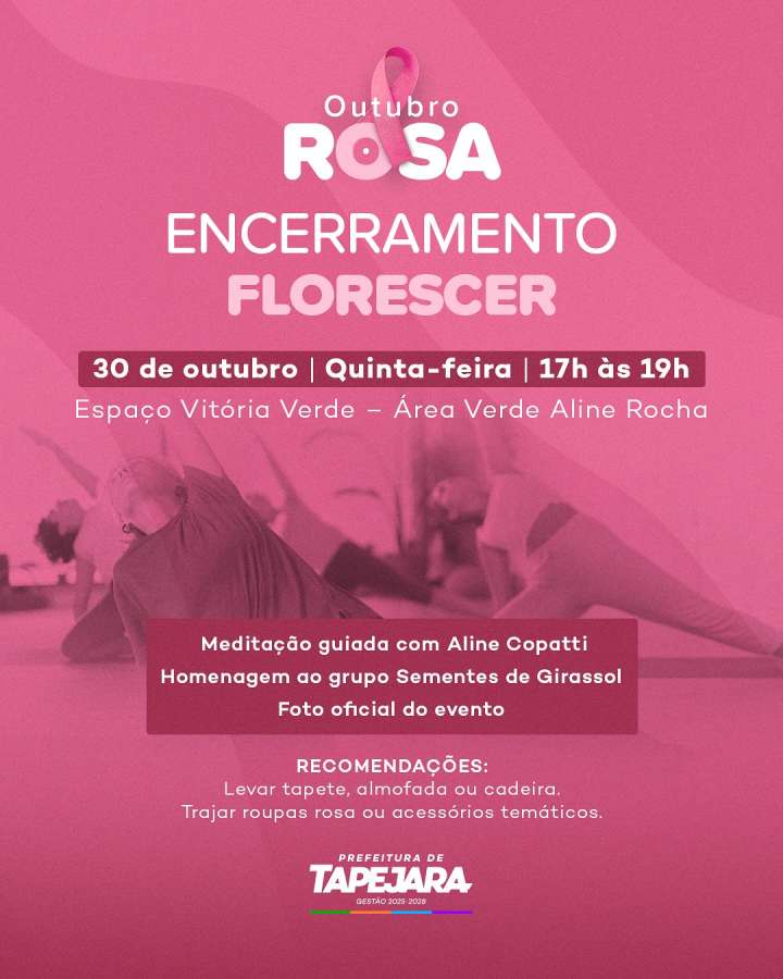 A Prefeitura de Tapejara promove nesta quinta-feira, 30 de outubro, o evento de encerramento do Outubro Rosa, com o tema “Florescer”. A atividade acontece das 17h às 19h, no Espaço Vitória Verde – Área Verde Aline Rocha.