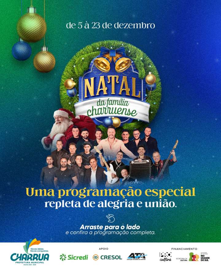 A Prefeitura de Charrua divulgou, nesta quarta-feira (05), a programação completa do Natal da Família Charruense. As festividades começam no dia 05 de dezembro, com atrações na Gruta Nossa Senhora de Lourdes, e seguem até o dia 23.