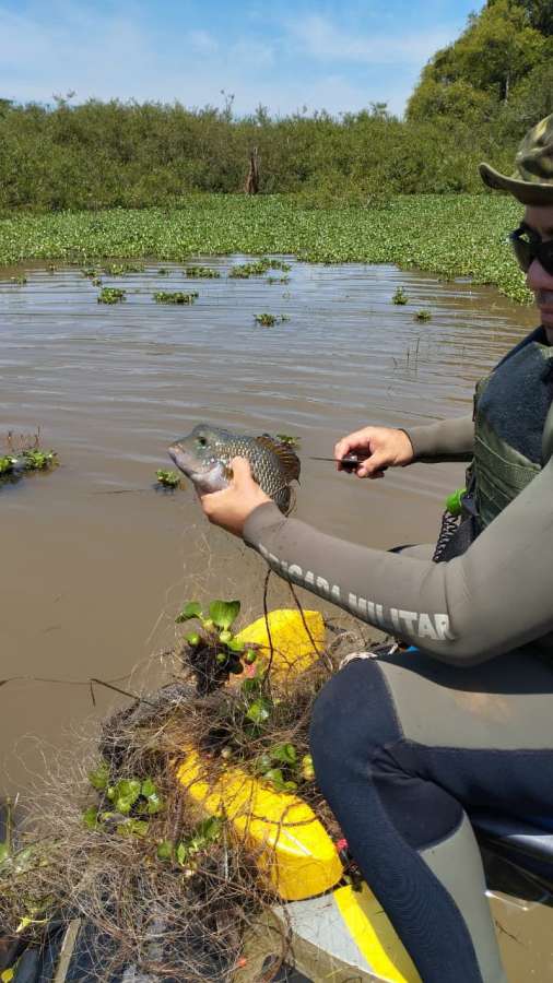 Na Barragem de Ernestina, bacia Hidrográfica do Rio Jacuí, houve patrulhamento aquático e apreendidos 120 metros de redes de pesca, inseridos ilegalmente, no ambiente aquático. Ainda, foram encontradas 21 “boias-loucas” - petrecho artesanal utilizado para a captura de peixes. Durante a remoção das redes, os policiais militares salvaram um pássaro, conhecido popularmente por Biguá, que estava preso ao petrecho.