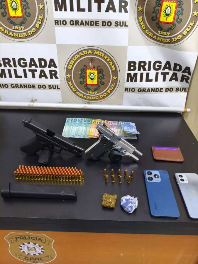 Durante patrulhamento ostensivo, as equipes abordaram dois suspeitos em pontos distintos da região. Em frente a uma residência, um dos homens tentou fugir para o interior do imóvel, mas acabou contido pelos policiais. Com ele, foram apreendidos uma pistola Glock 9mm com seletor de rajada, 81 munições, carregadores, duas porções de maconha e dinheiro.