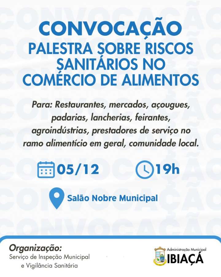 A Administração Municipal de Ibiaçá, por meio do Serviço de Inspeção Municipal (SIM) e da Vigilância Sanitária, está convocando profissionais e empreendimentos do ramo alimentício para uma palestra sobre riscos sanitários no comércio de alimentos.