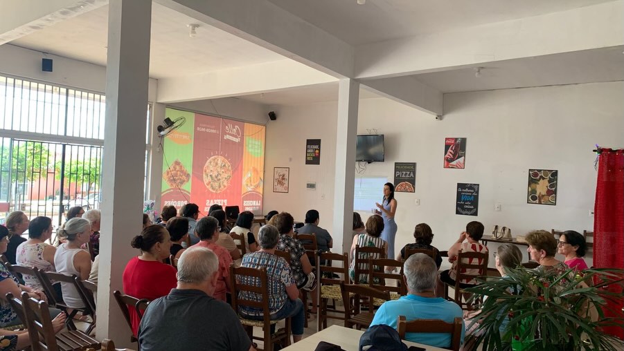 No ESF Santa Paulina, a médica Dra. Meirueli conduziu uma conversa com os participantes sobre cuidados com pessoas idosas e formas de prevenir quedas, tema essencial para a segurança e o bem-estar da população da terceira idade.