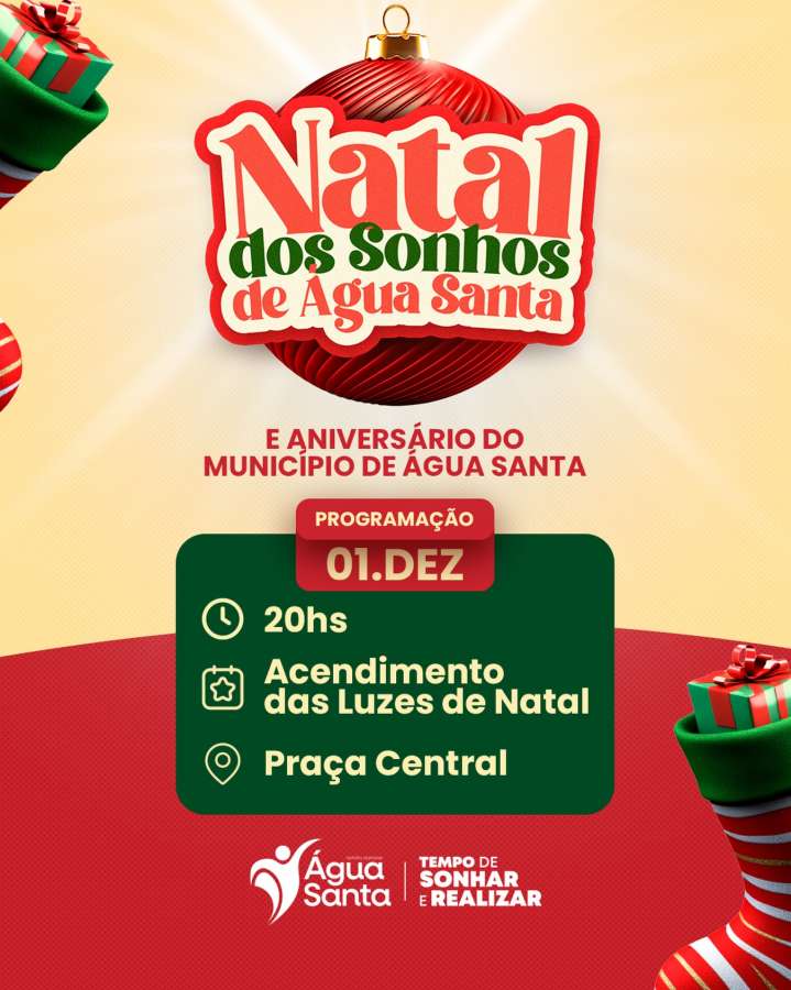 A Administração Municipal de Água Santa promove, nesta segunda-feira (1º), a abertura oficial do Natal dos Sonhos de Água Santa, evento que também integra as celebrações do aniversário do município. A programação ocorrerá na Praça Central, com início às 20h, marcando o acendimento das luzes natalinas e dando início ao período de festividades na cidade.