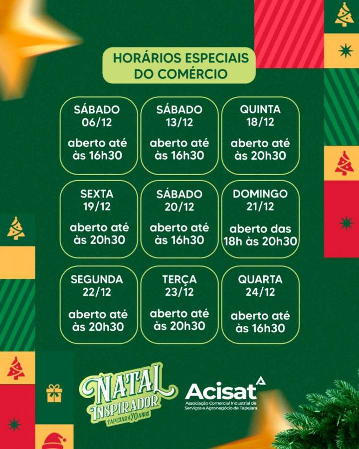 A Associação Comercial, Industrial de Serviços e Agonegócio de Tapejara (Acisat) divulgou os horários especiais de funcionamento do comércio para o período que antecede o Natal. As datas incluem ampliações de expediente em dias úteis, sábados e também no domingo que antecede a data comemorativa.