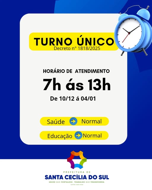 A Administração Municipal de Santa Cecília do Sul informou que, desde ontem, quarta-feira, dia 10 de dezembro, o atendimento passa a ocorrer em turno único, das 7h às 13h.