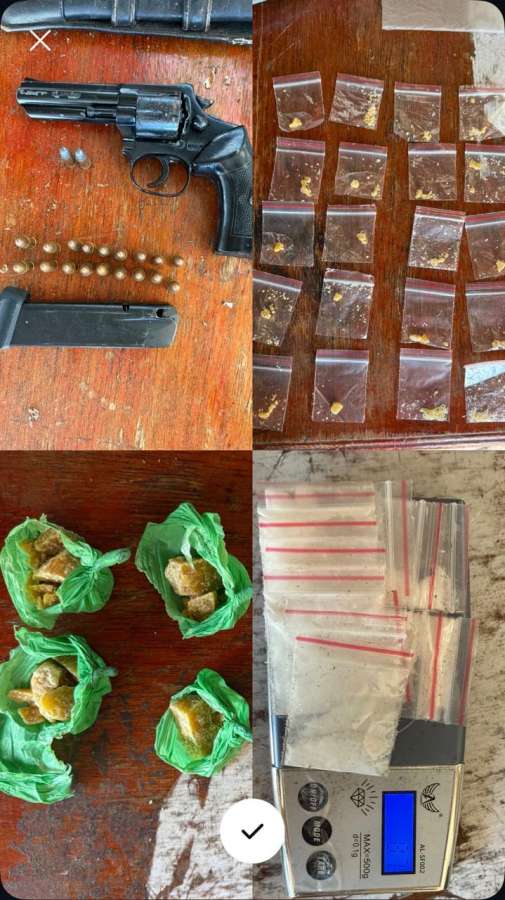 Durante as buscas, os policiais apreenderam cocaína e crack, armas e munições (incluindo munição 9 mm) e materiais usados na traficância, como balanças de precisão e embalagens do tipo ziplock, sendo parte da droga encontrada já fracionada e pronta para venda.