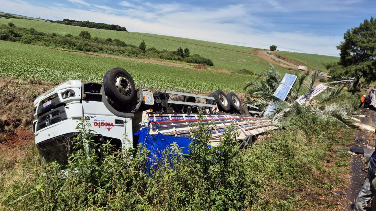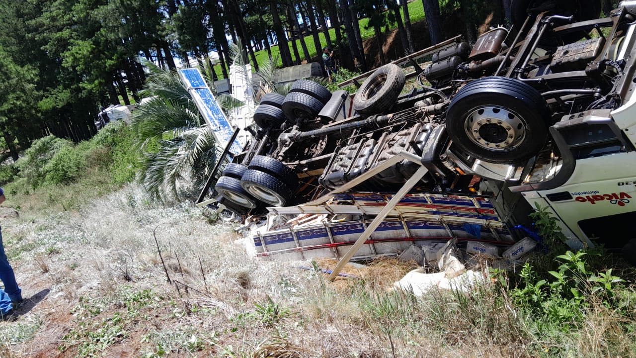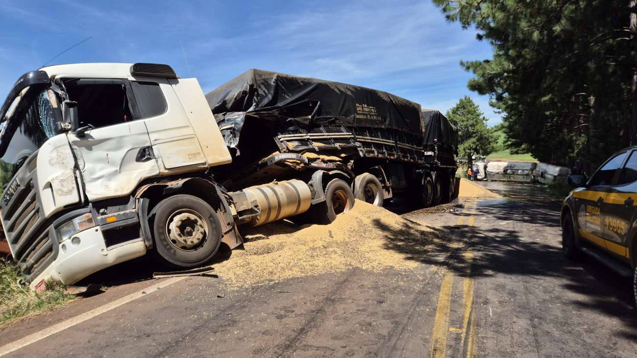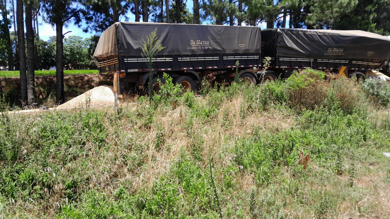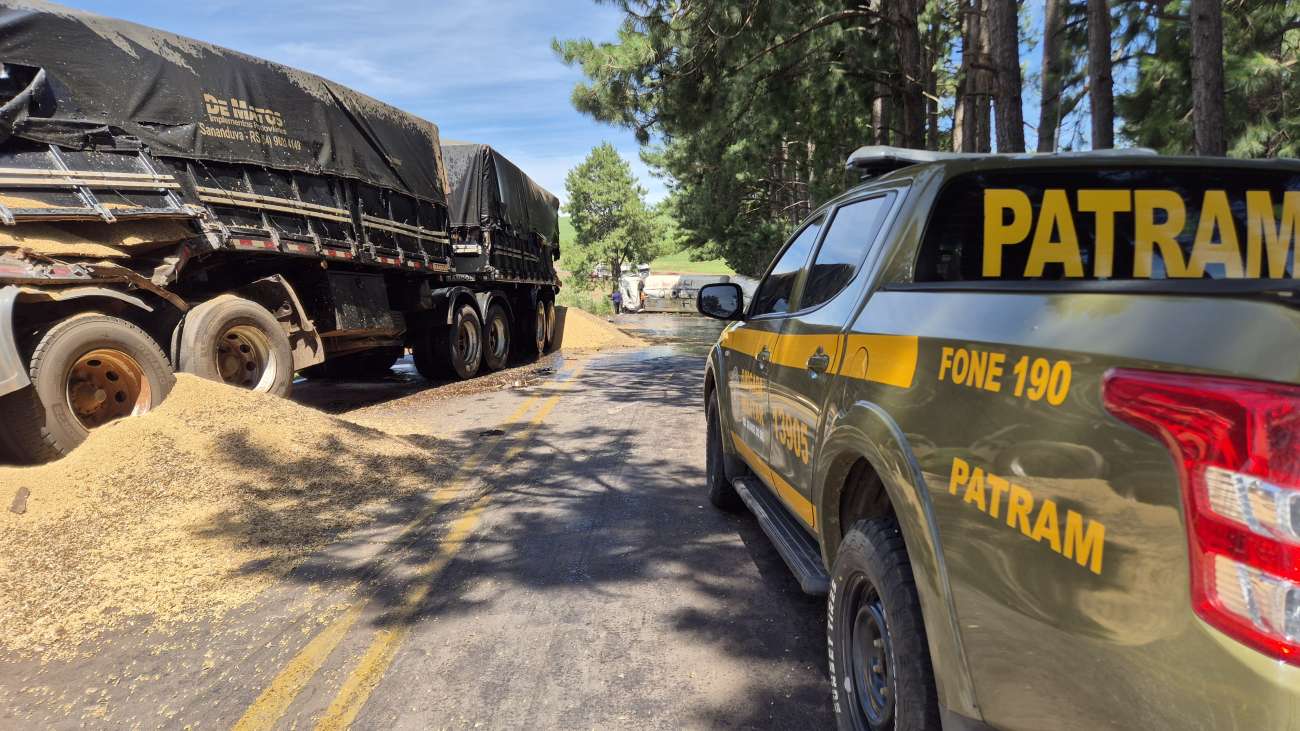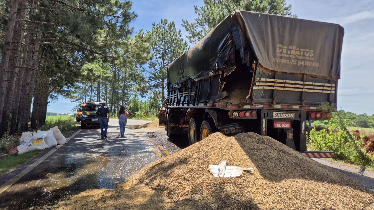 O caminhão também tombou e parou em um barranco à margem da rodovia. O bitrem carregado com soja permanece sobre a pista e bloqueia a faixa de trânsito em direção a Coxilha. Os motoristas, de 37 e 38 anos, respectivamente, não sofreram ferimentos.