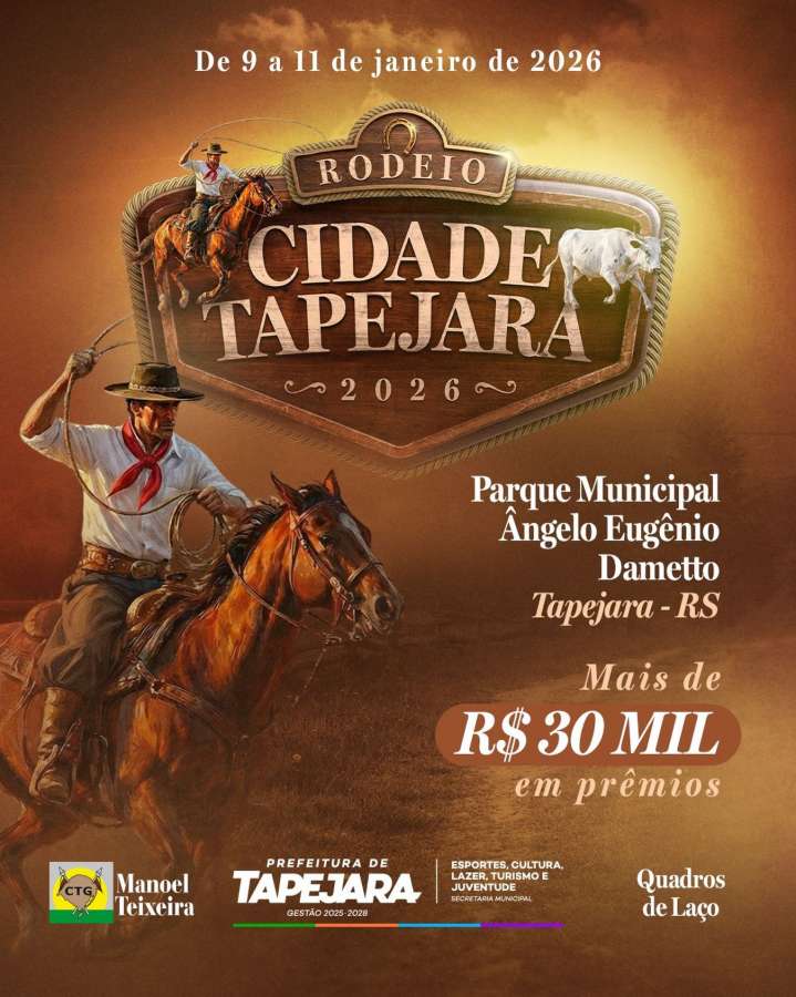 Tapejara se prepara para viver dias de intensa tradição gaúcha com a realização do Rodeio Cidade de Tapejara 2026, marcado para os dias 9, 10 e 11 de janeiro. O evento acontece no Parque Municipal Ângelo Eugênio Dametto e deve reunir competidores, famílias e amantes do tradicionalismo de toda a região.