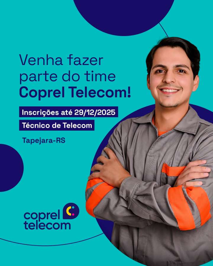 A Coprel Telecom está com vaga aberta para o cargo de Técnico de Telecom na cidade de Tapejara. Os requisitos para a função incluem ensino médio completo, conhecimentos em redes, protocolos e equipamentos de medição, além de residir em Tapejara e possuir Carteira Nacional de Habilitação (CNH) categoria B.