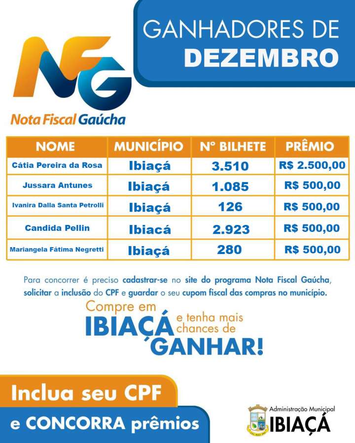 O município de Ibiaçá divulgou os ganhadores do Sorteio nº 159 do Programa Nota Fiscal Gaúcha, referente ao mês de dezembro de 2025. A premiação contemplou consumidores que solicitaram a inclusão do CPF na nota fiscal ao realizarem compras no comércio local.