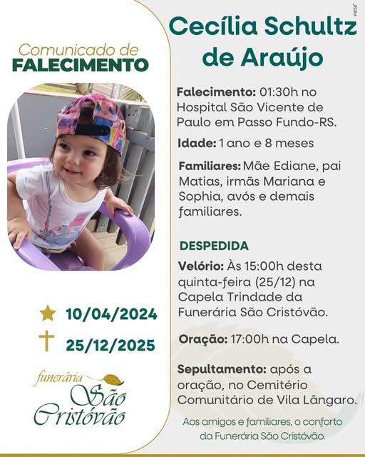 A menina Cecília Schultz de Araújo, de um ano e oito meses, de Vila Lângaro, sofreu um acidente em uma piscina residencial em Passo Fundo, na véspera de natal, dia 24.