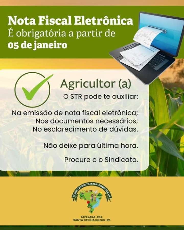 O Sindicato dos Trabalhadores Rurais (STR) de Tapejara e Santa Cecília do Sul alerta os produtores rurais que passa a vigorar a partir de hoje, 05 de janeiro de 2026, a obrigatoriedade da Nota Fiscal Eletrônica (NF-e) para a emissão de notas de produtor.