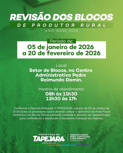 A Prefeitura de Tapejara, por meio da Secretaria de Desenvolvimento Rural, Agricultura e Meio Ambiente, iniciou nesta segunda-feira (5) o período de revisão dos blocos de produtor rural, referente ao ano-base 2025. O processo segue até o dia 20 de fevereiro de 2026.