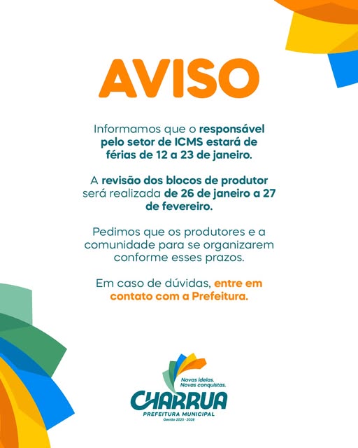 A Prefeitura de Charrua divulgou um aviso à comunidade e aos produtores rurais sobre o atendimento no setor de ICMS. Conforme a administração municipal, o responsável pelo setor estará de férias no período de 12 a 23 de janeiro.