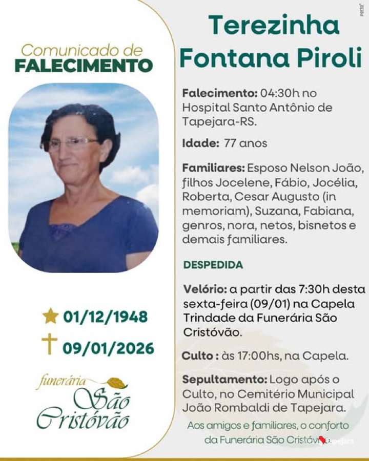 Faleceu TEREZINHA FONTANA PIROLI, às 4h30 de hoje (09), no Hospital Santo Antônio de Tapejara, com 77 anos. / Será velada a partir das 7h30 na Capela Trindade da Funerária São Cristóvão / Haverá CULTO às 17h, no local do velório e logo após será sepultada no Cemitério Municipal João Rombaldi de Tapejara
