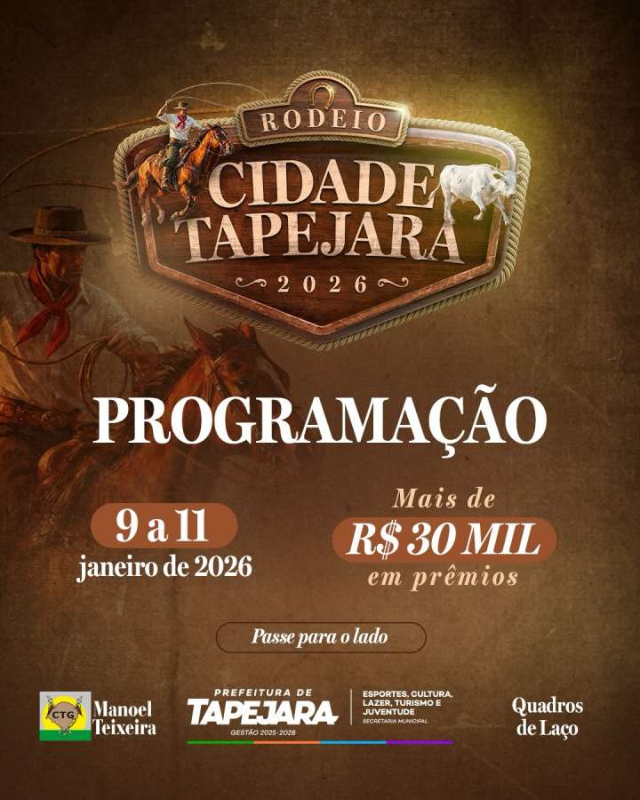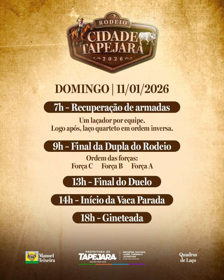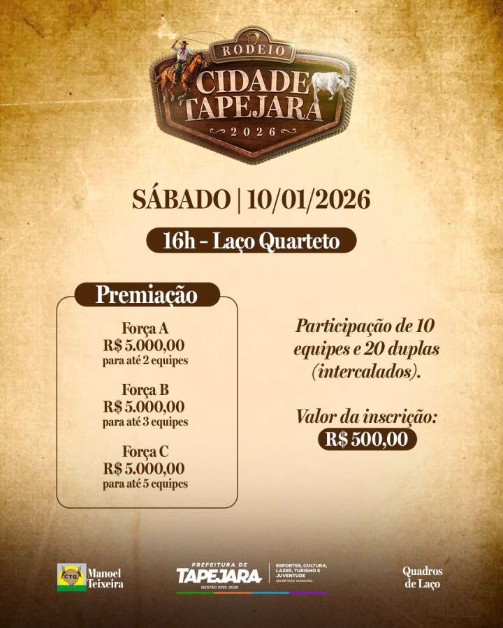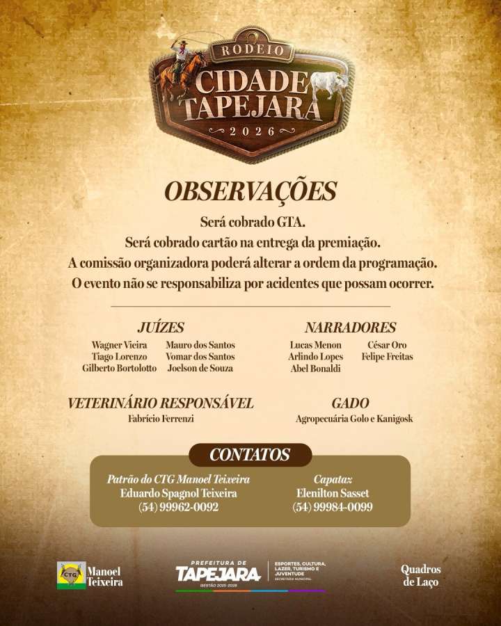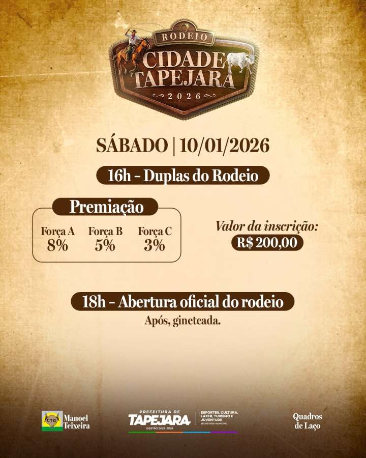 Começa nesta sexta-feira (09) o Rodeio Cidade Tapejara 2026, evento tradicionalista com provas de tiro de laço promovido pelo CTG Manoel Teixeira, Prefeitura e quadros de laço do município. A programação oficial está marcada para iniciar às 16h, com a modalidade de duelo.