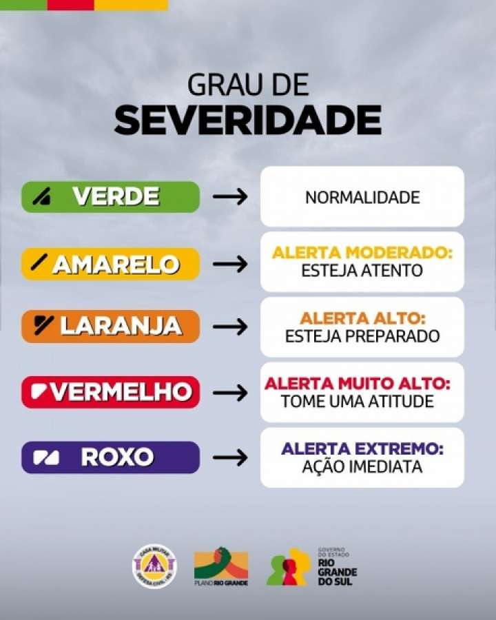 Atualmente, a emissão de alertas e avisos da Defesa Civil gaúcha conta com uma escala de cores, que estão associadas à severidade dos eventos hidrometeorológicos no Estado.