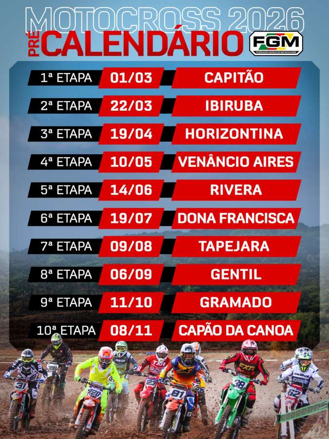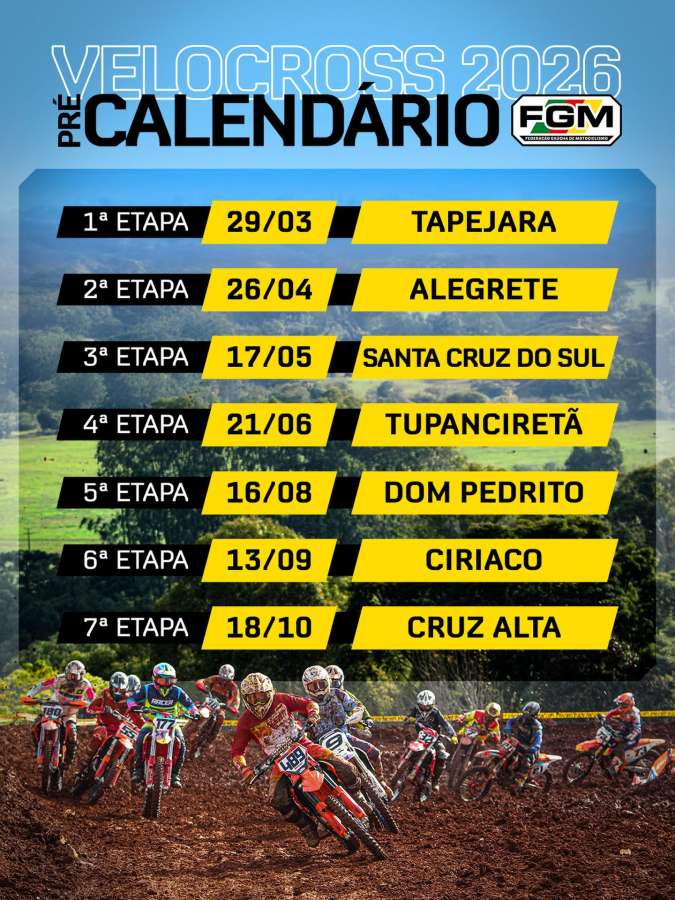 A Federação Gaúcha de Motociclismo (FGM) divulgou, por meio de suas redes sociais, o calendário oficial das etapas que irão compor os Campeonatos Gaúchos de Velocross e Motocross. Duas dessas etapas serão sediadas em Tapejara.