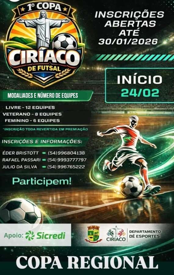 O município de Ciriaco está com inscrições abertas para a 1ª Copa Ciriaco de Futsal, competição regional que reunirá equipes de diferentes cidades da região. O prazo para inscrição segue até o dia 30 de janeiro de 2026, e o início da competição está previsto para o dia 24 de fevereiro.