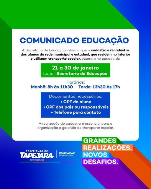 A Secretaria de Educação reforça que o cadastro é obrigatório e indispensável para assegurar o acesso dos estudantes ao transporte escolar de forma segura e organizada.