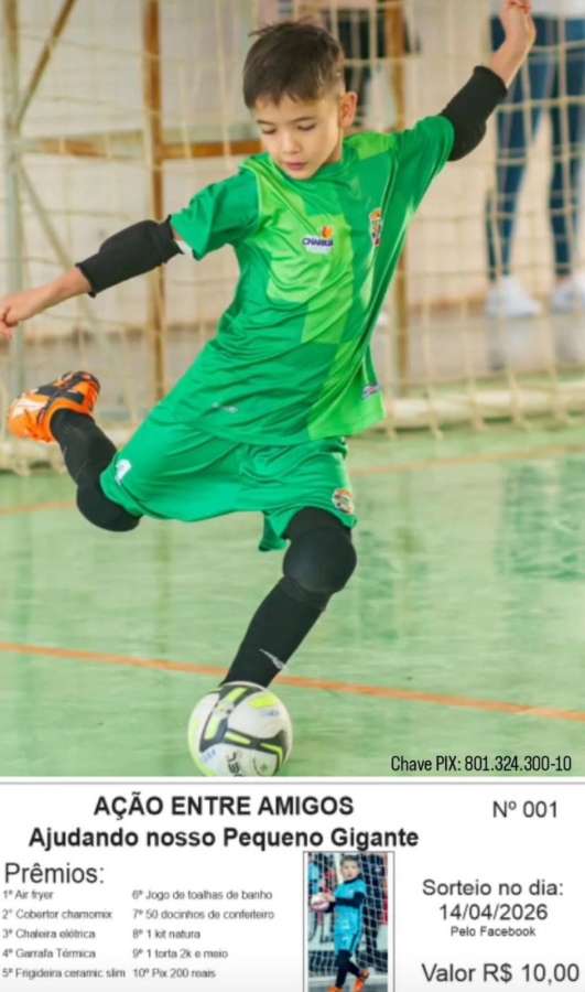 Diante dos altos custos e da necessidade de dar continuidade aos cuidados médicos, a família está promovendo uma rifa solidária para arrecadar recursos. Cada cartela custa R$ 10,00 e dá direito a concorrer a dez prêmios: uma air fryer, um cobertor, uma chaleira elétrica, uma garrafa térmica, uma frigideira, um jogo de toalhas, um kit com 50 docinhos de festa, um kit da Natura, uma torta e um Pix de R$ 200,00. O sorteio será realizado no dia 14 de abril.