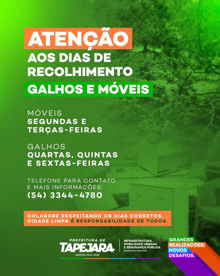 A Prefeitura de Tapejara reforça o alerta à comunidade sobre os dias corretos para o recolhimento de galhos e móveis, com o objetivo de manter a cidade limpa, organizada e ambientalmente responsável.