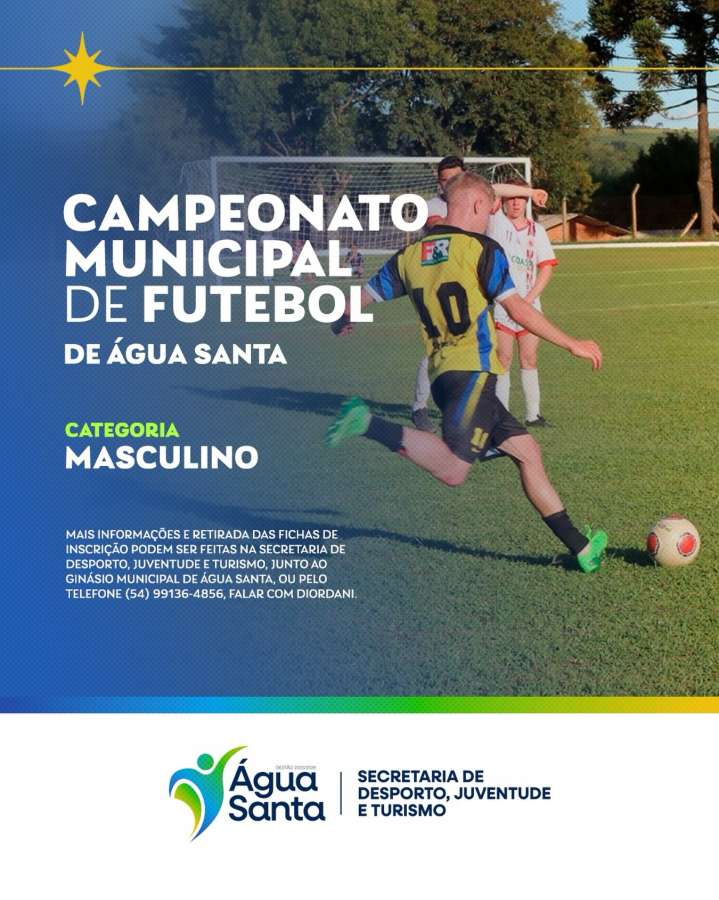 A Prefeitura de Água Santa, por meio da Secretaria de Desporto, Juventude e Turismo, informa que estão abertas as inscrições para o Campeonato Municipal de Futebol de Campo – Categoria Masculino.