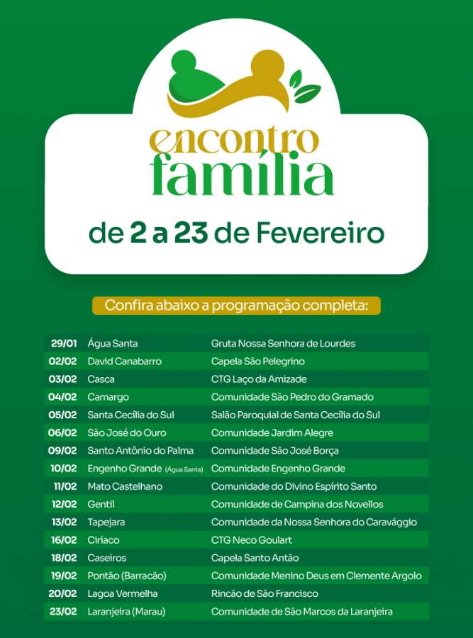 Hoje, quarta, dia 4, será realizado na Comunidade São Pedro do Gramado; em Santa Cecília do Sul, na quinta, dia 5, no Salão Paroquial; e em São José do Ouro, na sexta, dia 6, na Comunidade Jardim Alegre, mantendo a mesma palestrante e temática ao longo destes dias.