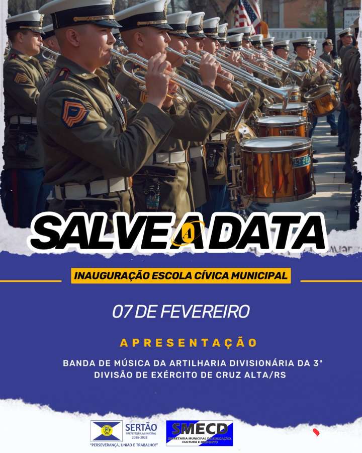 A Administração Municipal de Sertão convida a comunidade para a inauguração da Escola Cívica Municipal João Antônio de Col, que ocorrerá no dia 7 de fevereiro de 2026, a partir das 13h30.