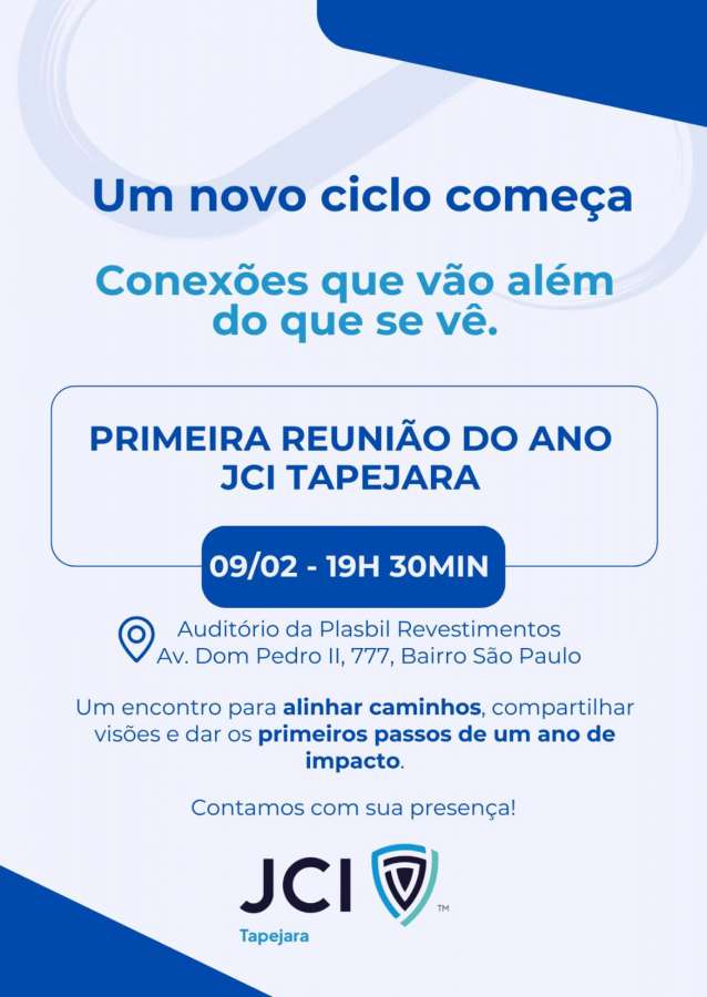 A JCI Tapejara promove, na próxima segunda-feira, dia 9 de fevereiro, a Primeira Reunião Plenária de 2026, marcando oficialmente o início das atividades da entidade neste novo ano. O encontro será realizado no Auditório da Plasbil.