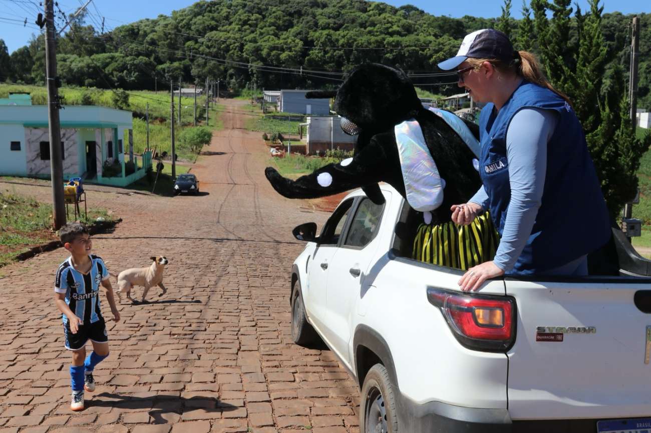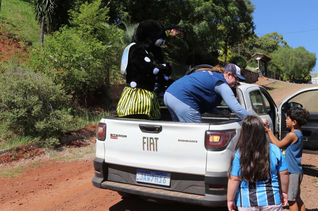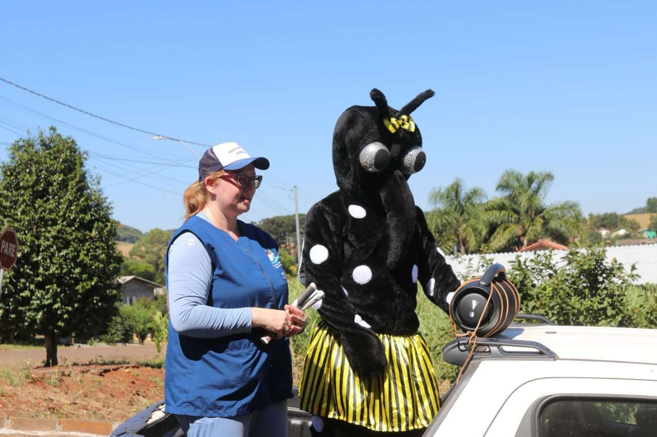 Durante a mobilização, os Agentes de Combate às Endemias, acompanhados do personagem do Aedes Aegypti, realizaram a distribuição de folders informativos com dicas de prevenção. As crianças também receberam balas, tornando a abordagem mais lúdica e educativa, aproximando o tema de forma divertida e facilitando a conscientização desde a infância.