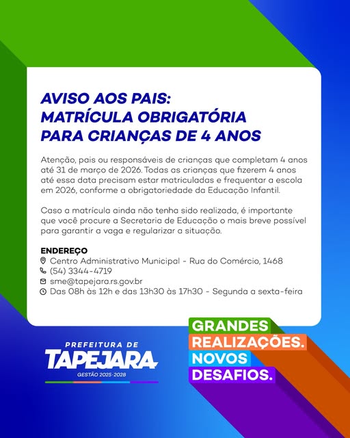 A Prefeitura de Tapejara, por meio da Secretaria Municipal de Educação (SME), emite um alerta importante aos pais e responsáveis sobre a matrícula obrigatória de crianças que completam 4 anos até o dia 31 de março de 2026. Conforme determina a legislação educacional vigente, todas essas crianças devem estar devidamente matriculadas e frequentando a Educação Infantil no ano letivo de 2026.
