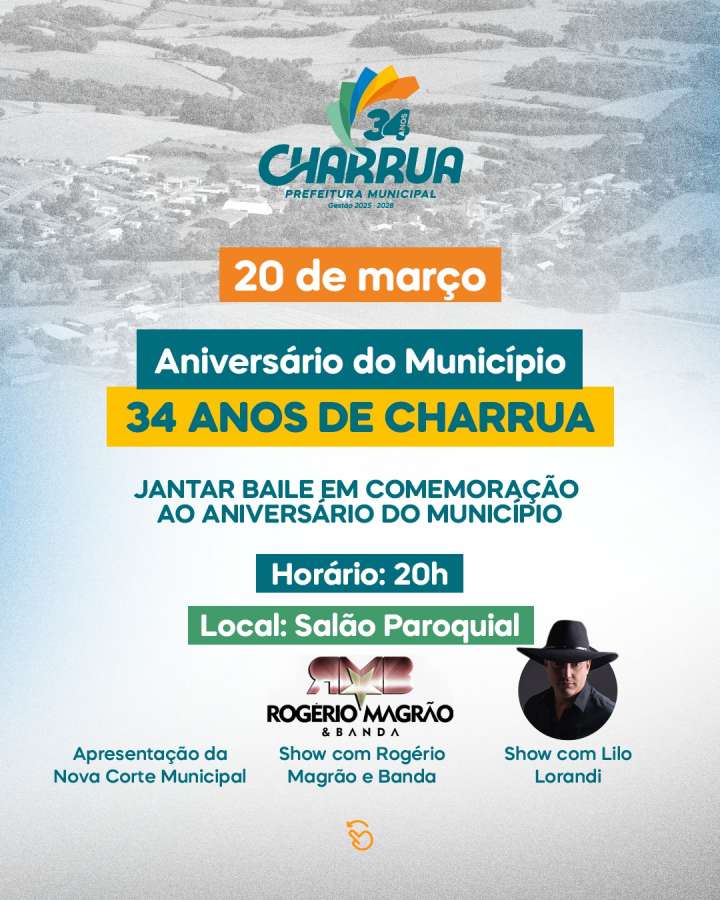 As comemorações seguem no dia 20 de março, data oficial do aniversário do município, com o Jantar Baile em comemoração aos 34 anos de Charrua, a partir das 20h, no Salão Paroquial. O evento contará com apresentação da nova corte municipal e atrações musicais.