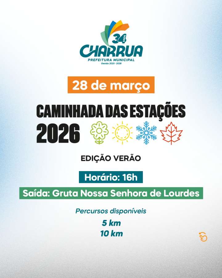 Encerrando a programação, no dia 28 de março, ocorre a Caminhada das Estações – Edição Verão, com saída às 16h da Gruta Nossa Senhora de Lourdes. Os participantes poderão escolher entre percursos de 5 km e 10 km.