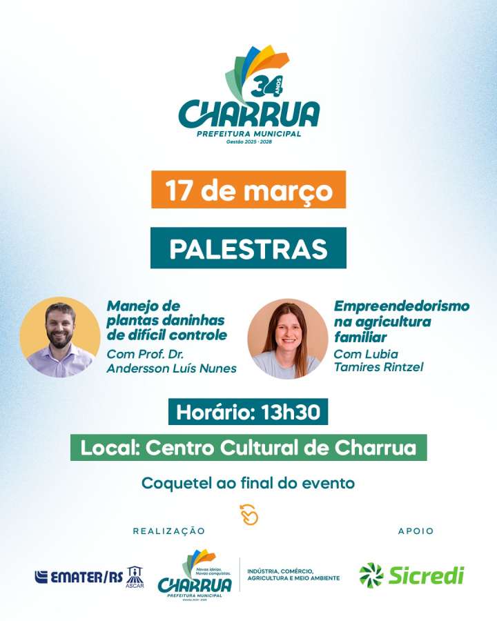 A agenda tem início no dia 14 de março, com o Torneio de Vôlei, realizado a partir das 9h, na quadra da área da Cidade Baixa. No dia 17 de março, o Centro Cultural de Charrua recebe um ciclo de palestras, às 13h30, abordando temas como manejo de plantas daninhas e empreendedorismo na agricultura familiar.